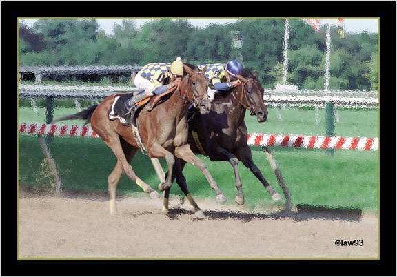 These two daughters of Broad Brush provided a one-two punch for owner/breeder Robert E. Meyerhoff when Broad Gains (outside-E. Prado) and Tennis Lady (rail-A. Seefeldt) left the field behind and came to the wire as one in the 1993 Twixt Stakes at Pimlico.