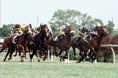 Keene Dancer (third from right-shadow roll), a three year old bay colt by Seattle Dancer trained by David Carroll, settled in behind the Linda Rice-trainee, Soldier Field (Richard Migliore) and Carlos Marquez aboard Skeedattle Dancer early in the race, but drew off to easily defeat the field of turfers in the $200,000 Kent Breeders' Cup Stakes for three year olds.
